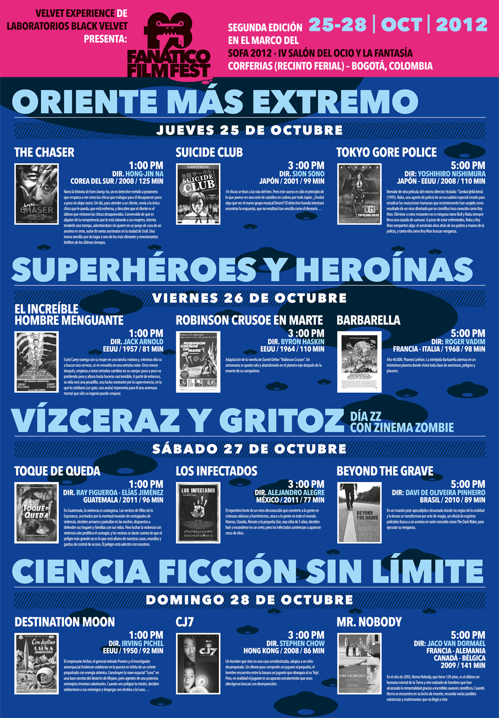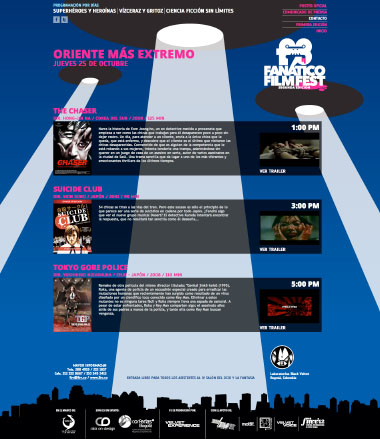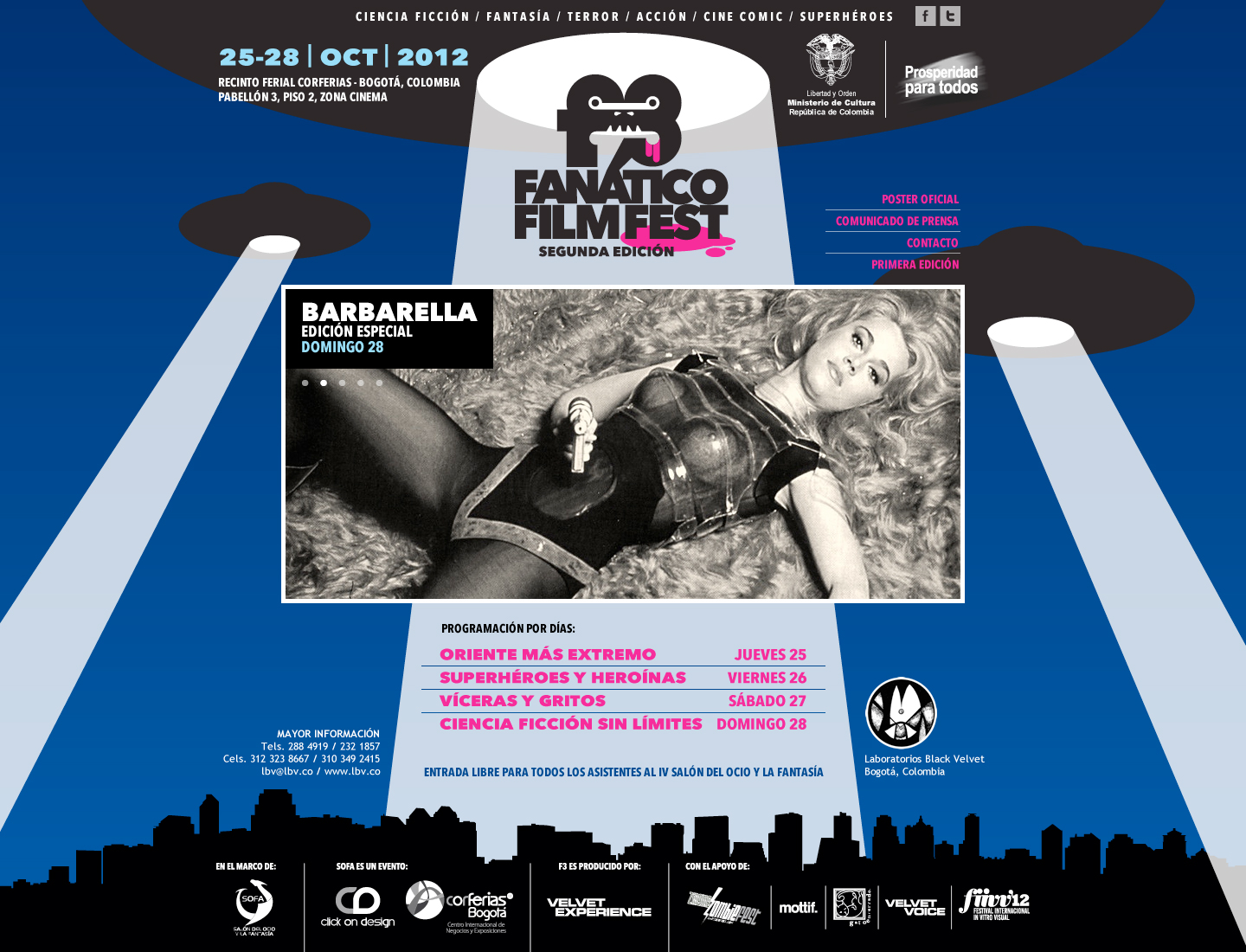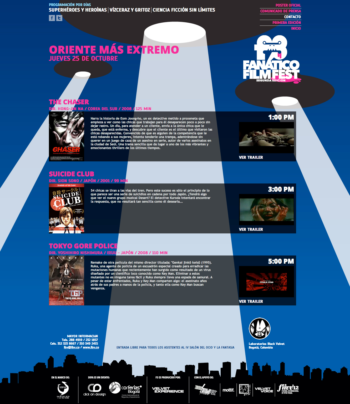 Con un selecto menú de películas de culto, el F3 nos permitió ver rarezas del cine a las que pocas veces se tiene acceso en Colombia. Sus cuatro divisiones: Oriente más extremo, Superhéroes y heroínas, Vísceras y gritos, y Ciencia ficción sin límite. En su gráfica le apostamos a la ilustración vectorial minimalista: en 2011, un nervioso logo del F3 es acosado por un ojo gigante; en 2012, el mismo logo es abducido por extraterrestres.