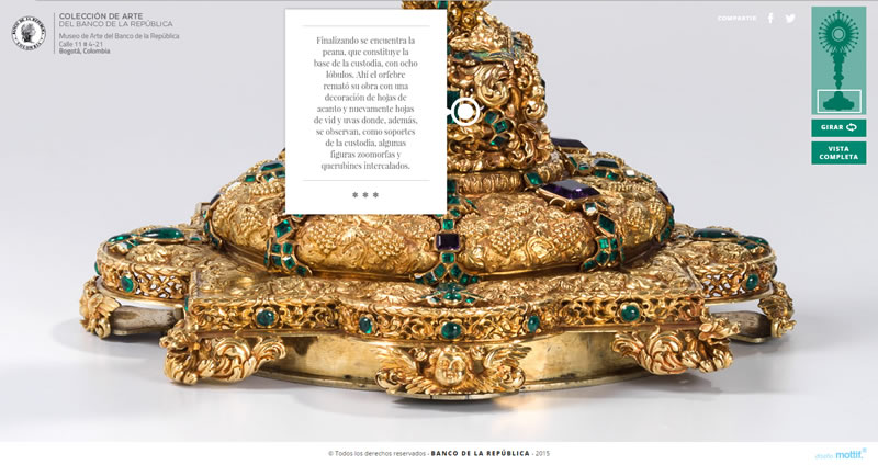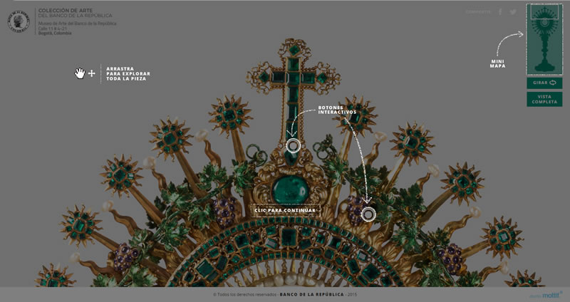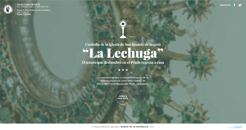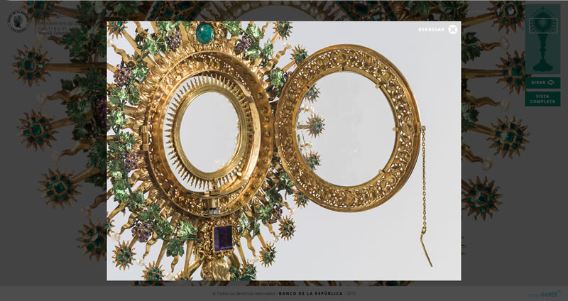 Con este nombre se conoce también a la custodia de la iglesia de San Ignacio de Bogotá. Es una preciosidad y tiene muchas historias para contar. Es prácticamente un milagro el que siga entera y completica después de todas por las que ha pasado. Estuvo en Madrid en la feria de arte ARCO descrestando a todo el mundo y con motivo de su regreso al país nos fue encomendado este micrositio interactivo para conocerla en detalle. Quedará deslumbrado por los cientos de piedras preciosas, los datos, las imágenes y claro, el diseño del sitio.